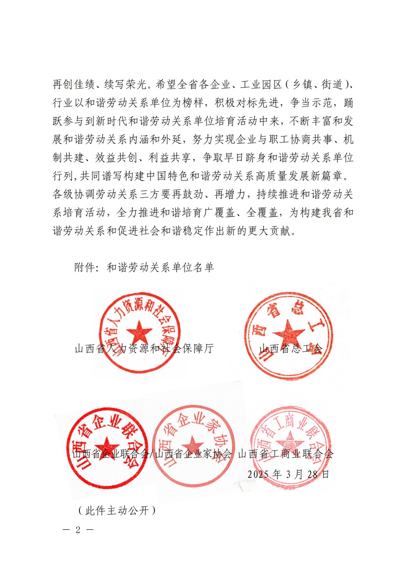 近日,山西省人社廳、山西省總工會(huì)等5部門聯(lián)合發(fā)布2025年山西省和諧勞動(dòng)關(guān)系單位名單,共有110個(gè)單位入選。集團(tuán)成為晉城四個(gè)和諧勞動(dòng)關(guān)系企業(yè)之一。
