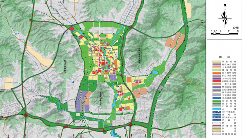 規(guī)劃采取非均衡發(fā)展策略,構(gòu)建圍繞中心城市的“手掌”狀半小時(shí)經(jīng)濟(jì)圈,中心城區(qū)為“掌心”,交通軸線(xiàn)為“手指”,沿線(xiàn)城鎮(zhèn)和產(chǎn)業(yè)園區(qū)為“關(guān)節(jié)”,打造 1+5 城鎮(zhèn)與產(chǎn)業(yè)集聚區(qū),提高城市核心競(jìng)爭(zhēng)力,提升區(qū)域協(xié)作水平,確定了“一城三區(qū)”組團(tuán)空間結(jié)構(gòu),將城市西南片區(qū)及米山片區(qū)納入城市建設(shè)用地范圍,提出了“擁山不占山,營(yíng)水親近水”的生態(tài)綠地建設(shè)原則,構(gòu)建了“五山相擁、四河相匯”的生態(tài)綠地系統(tǒng),將周邊山體引入城市,將城市河流與大自然相連。