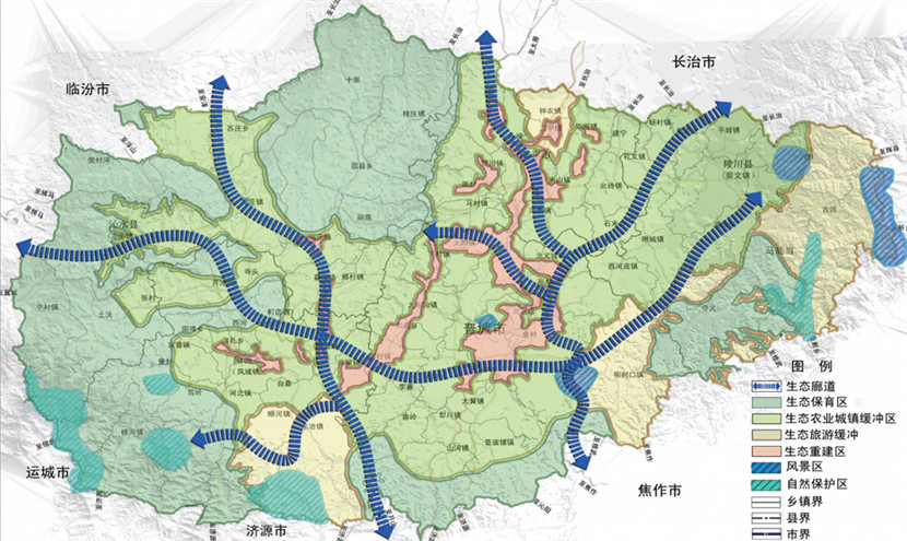 與中國城市規(guī)劃設(shè)計研究院合作規(guī)劃經(jīng)過充分調(diào)研,確定了晉城市為全國無煙煤基地和潔凈能源基地,山西省煤化工基地和電力生產(chǎn)基地的發(fā)展定位,根據(jù)產(chǎn)業(yè)發(fā)展、生態(tài)環(huán)境保護要求,設(shè)立產(chǎn)業(yè)準入門檻和要求,提出了“三區(qū)、四軸、三極”的產(chǎn)業(yè)空間新格局。在產(chǎn)業(yè)發(fā)展的同時要加大生態(tài)環(huán)境保護力度,控制污染工業(yè)發(fā)展規(guī)模與總量,嚴禁高污染工業(yè)的再布局。積極發(fā)展生態(tài)旅游業(yè),著重打造太行絕頂旅游區(qū)、丹河旅游區(qū)、城郊旅游區(qū)、沁河旅游區(qū)、歷山旅游區(qū)五大旅游區(qū)。